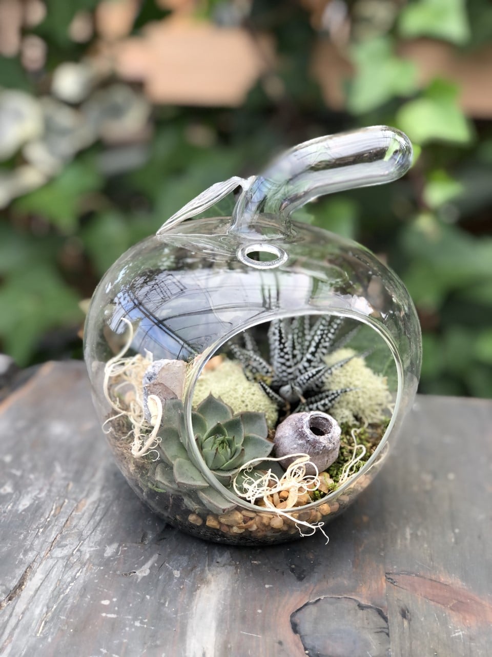 This kit includes a charming apple-shaped glass planter that’s perfect for displaying the two lovely plants we’ve included – a 2″ haworthia and a 2″ succulent.