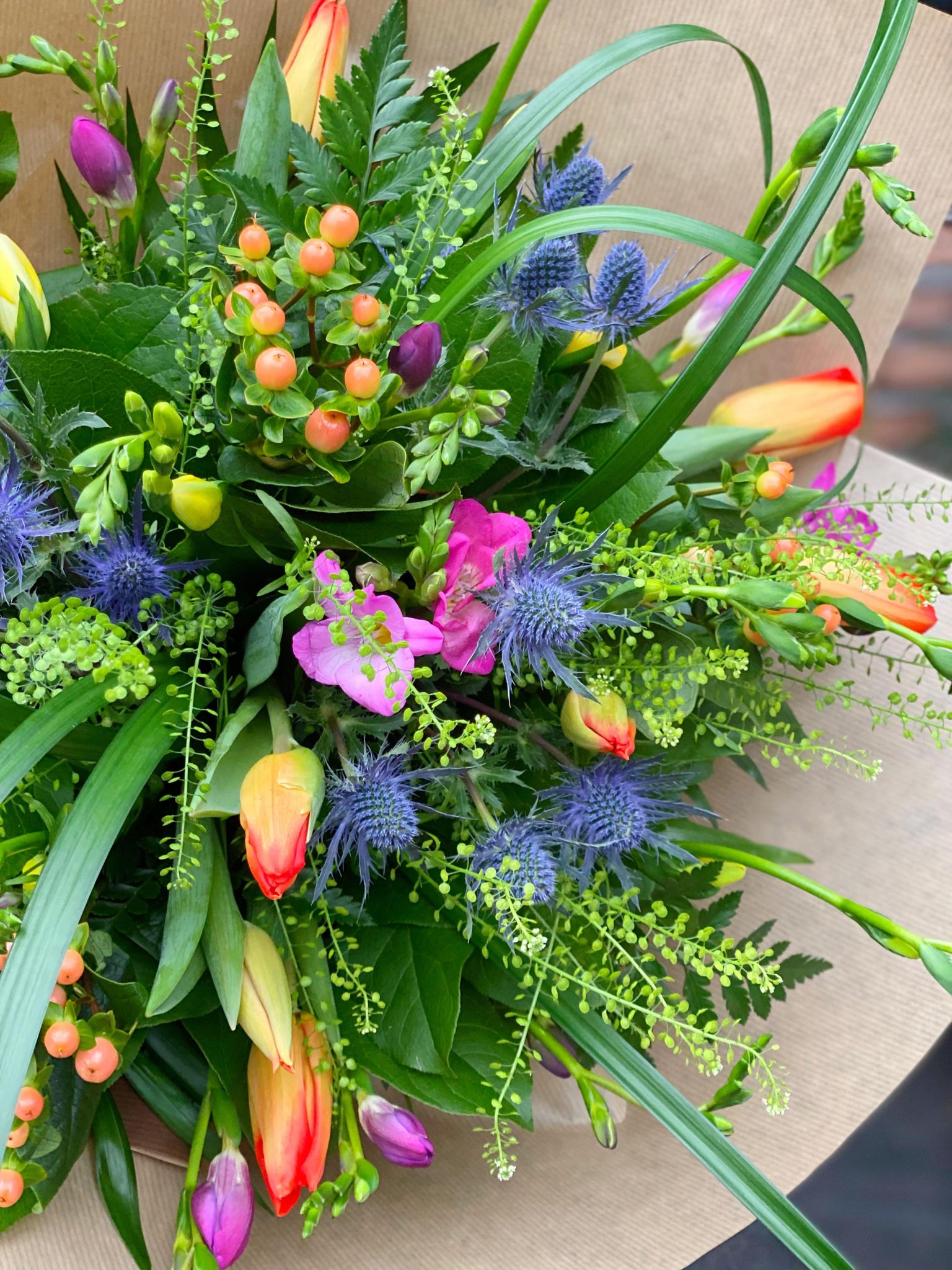 The vibrancy of tulips, freesias, hypercium, and blue thistle are complemented by lush garden greenery in this design to create a hand-tied celebration. Add a burst of colour to any occasion or to transform an otherwise ordinary day with this bouquet of pure joy.