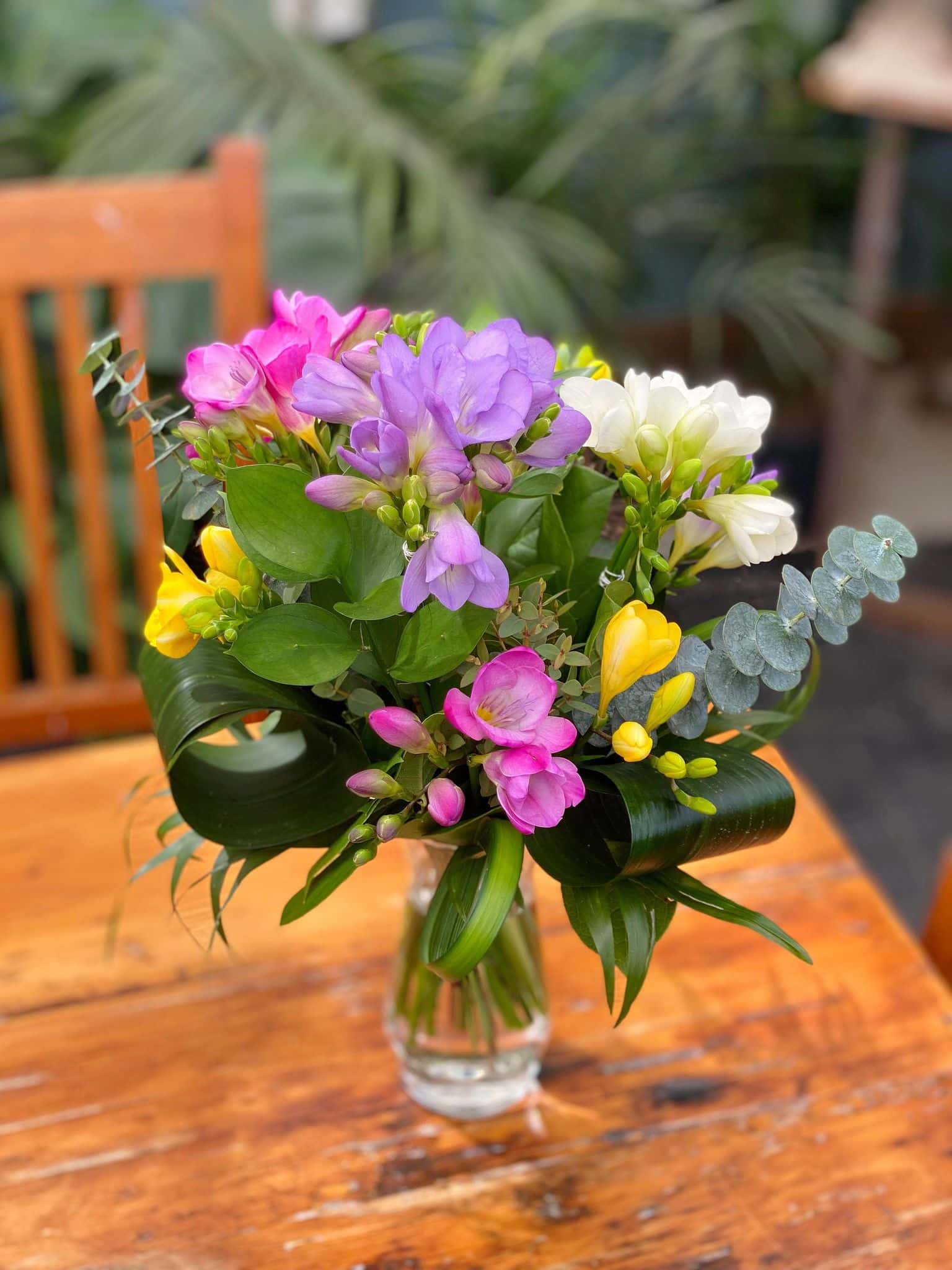- Featuring all freesia and garden greenery, this arrangement will fit perfectly on any desk to enjoy.