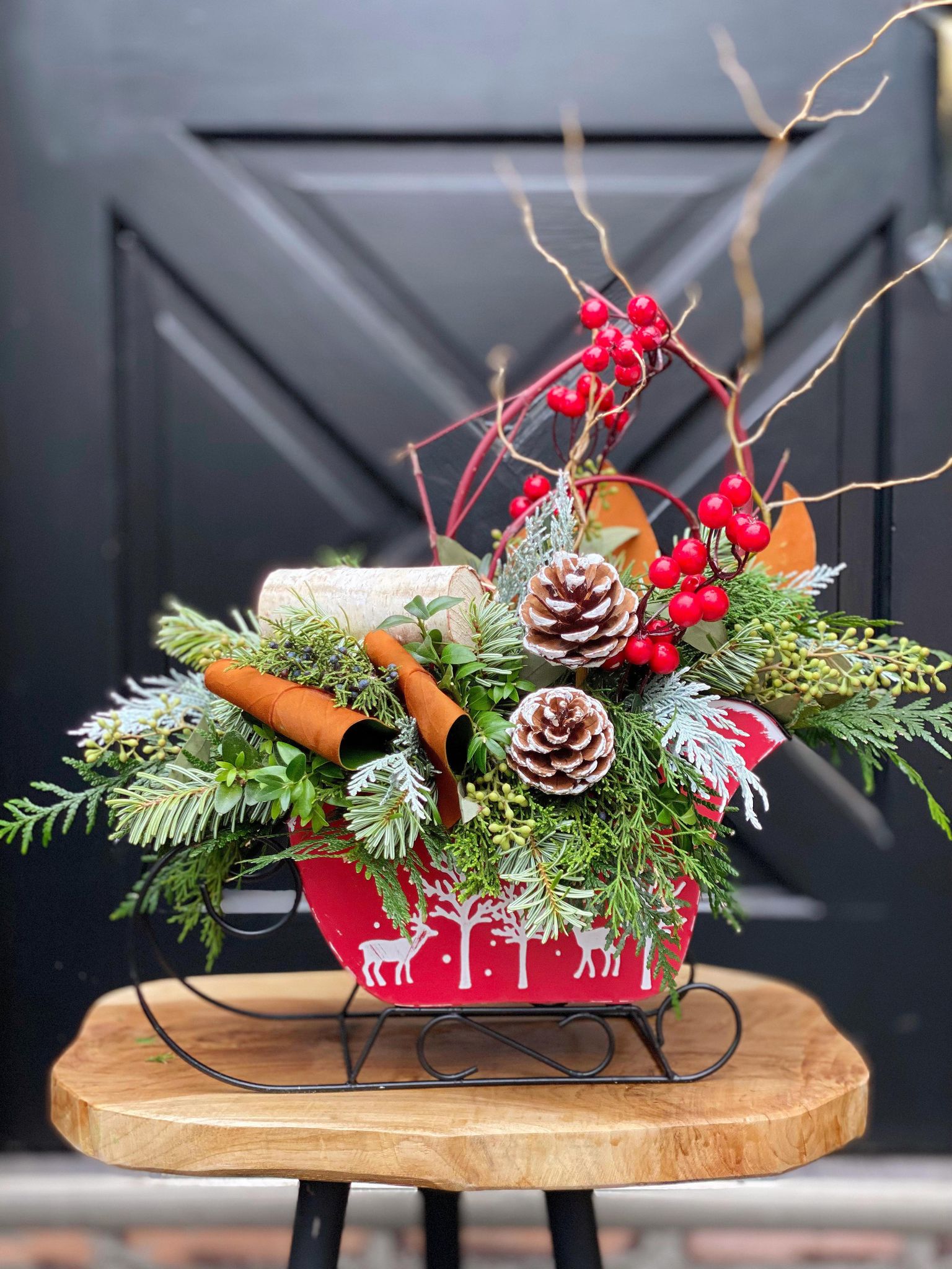 Design a beautiful Christmas greenery arrangement in a nostalgic red sleigh. Beautiful rich hues of bronzed magnolia leaves are used throughout an assortment of fresh Christmas greenery, plus, decorate with pine cones, berries, twigs and more. This spectacular arrangement may find its home as a centerpiece for your holiday table or there are so many other endless possibilities. Once the season is over keep and redesign with fresh Christmas foliage or possibly use to display holiday bon bons for next years festivities.