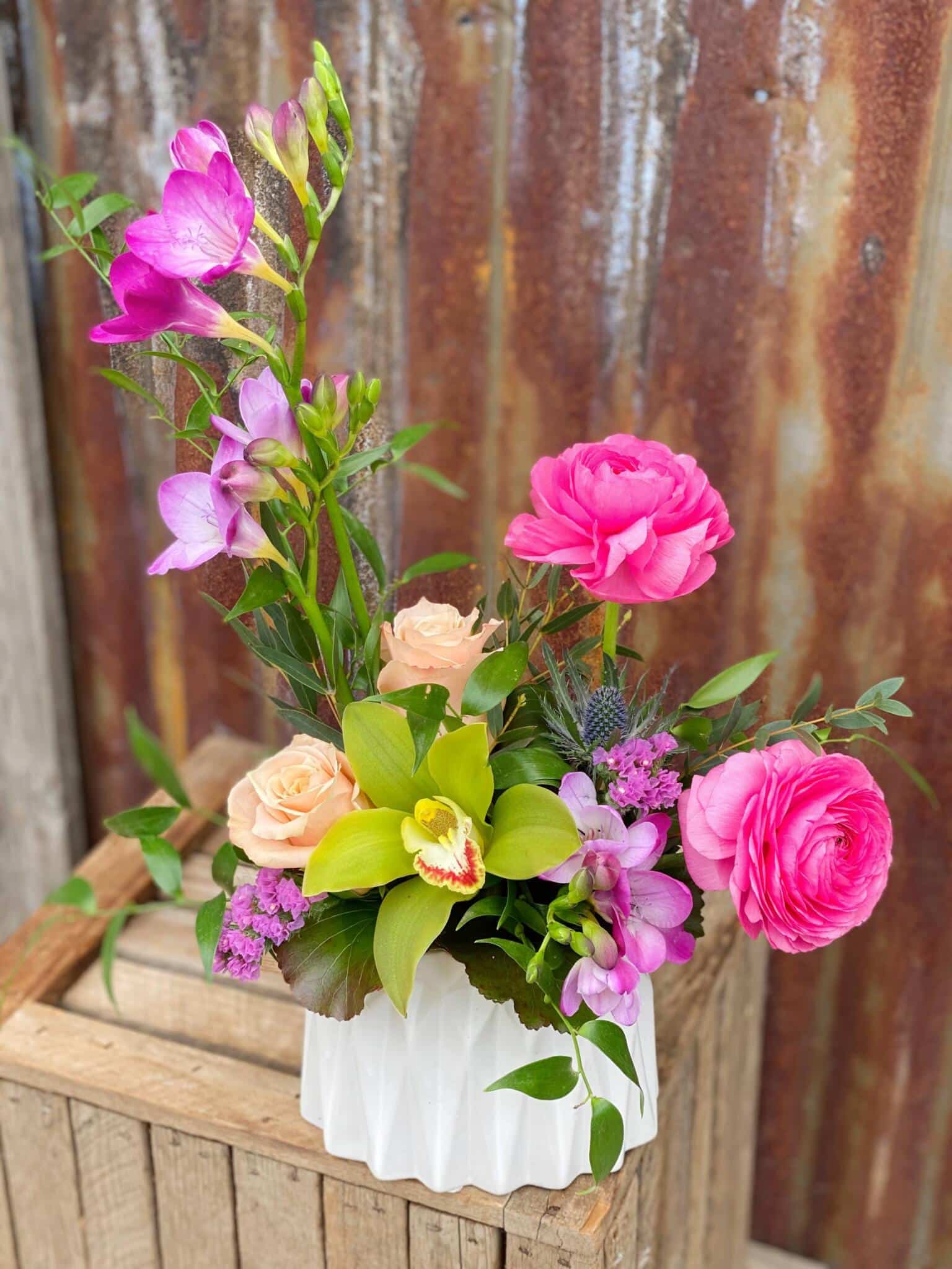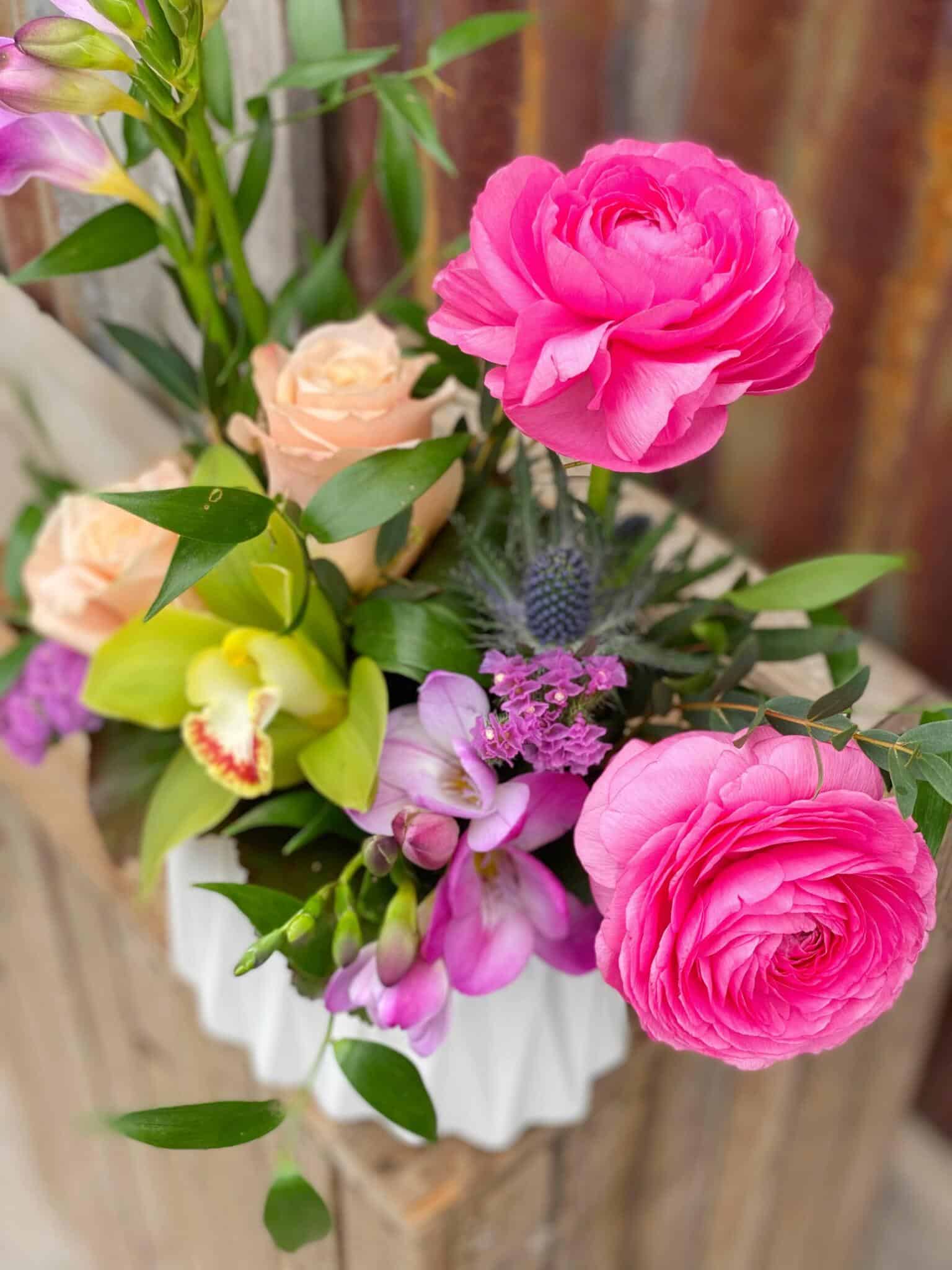 - features peach roses, hot pink ranunculus, a green cymbidium bloom, and freesia