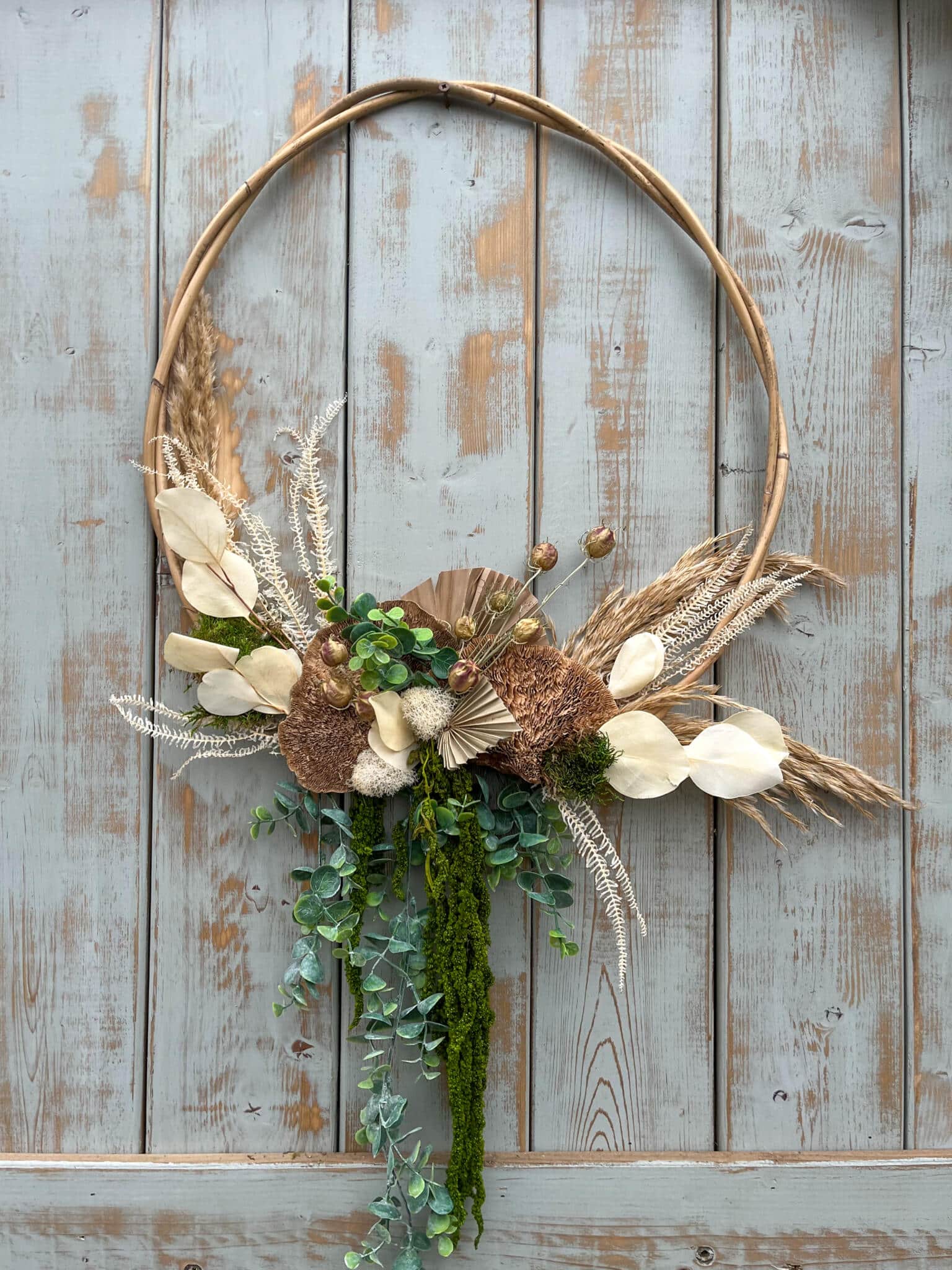 Our expert floral designers will guide you through the process of crafting a stunning dried flower arrangement on a rattan hoop that will last for years.