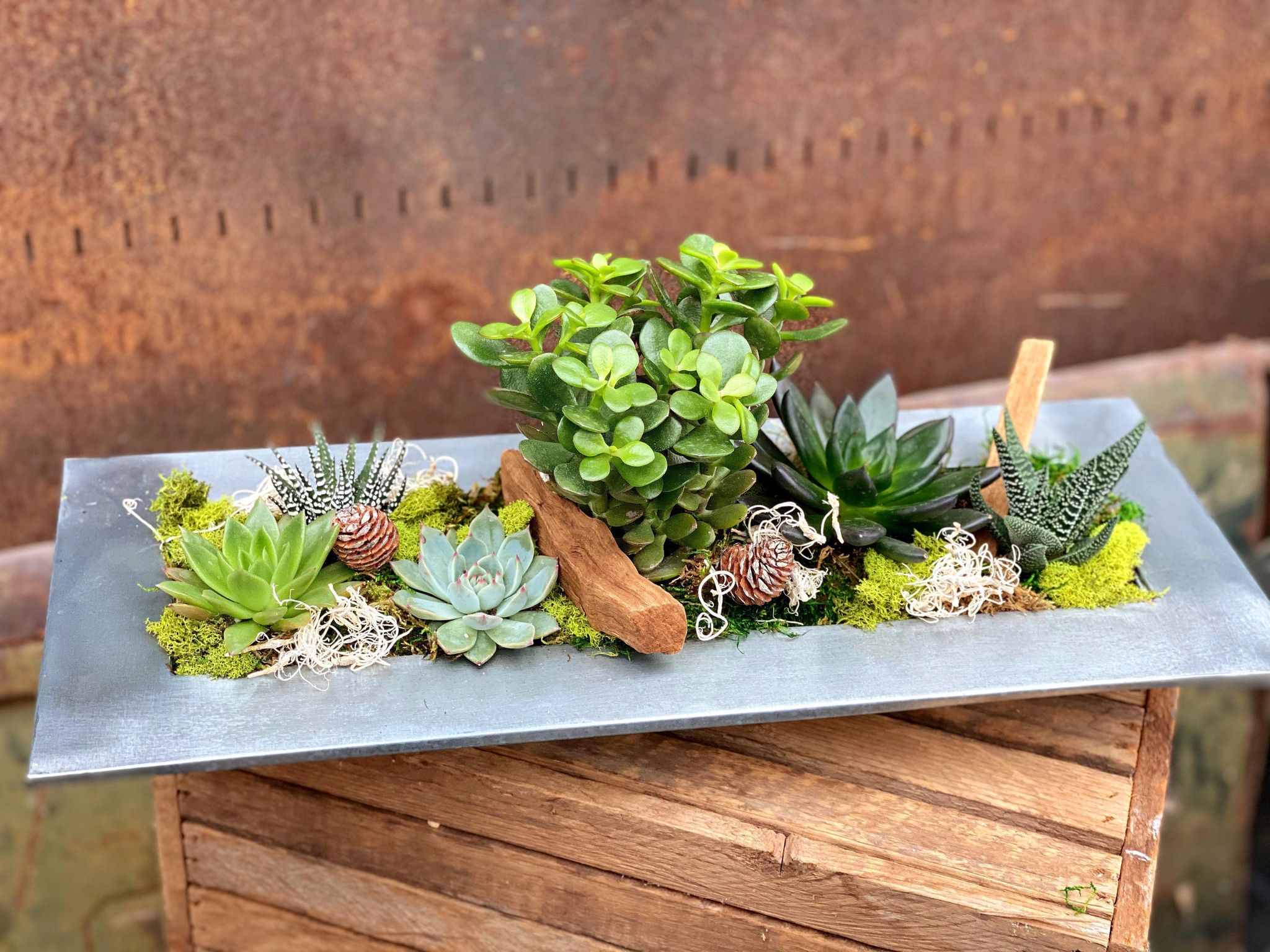 Our succulent designs feature a myriad of textures, shapes and colours. Low maintenance and long lasting, this design includes a variety of succulents. Each design is expertly completed with just the right touch of mosses, rocks and rustic decoration.