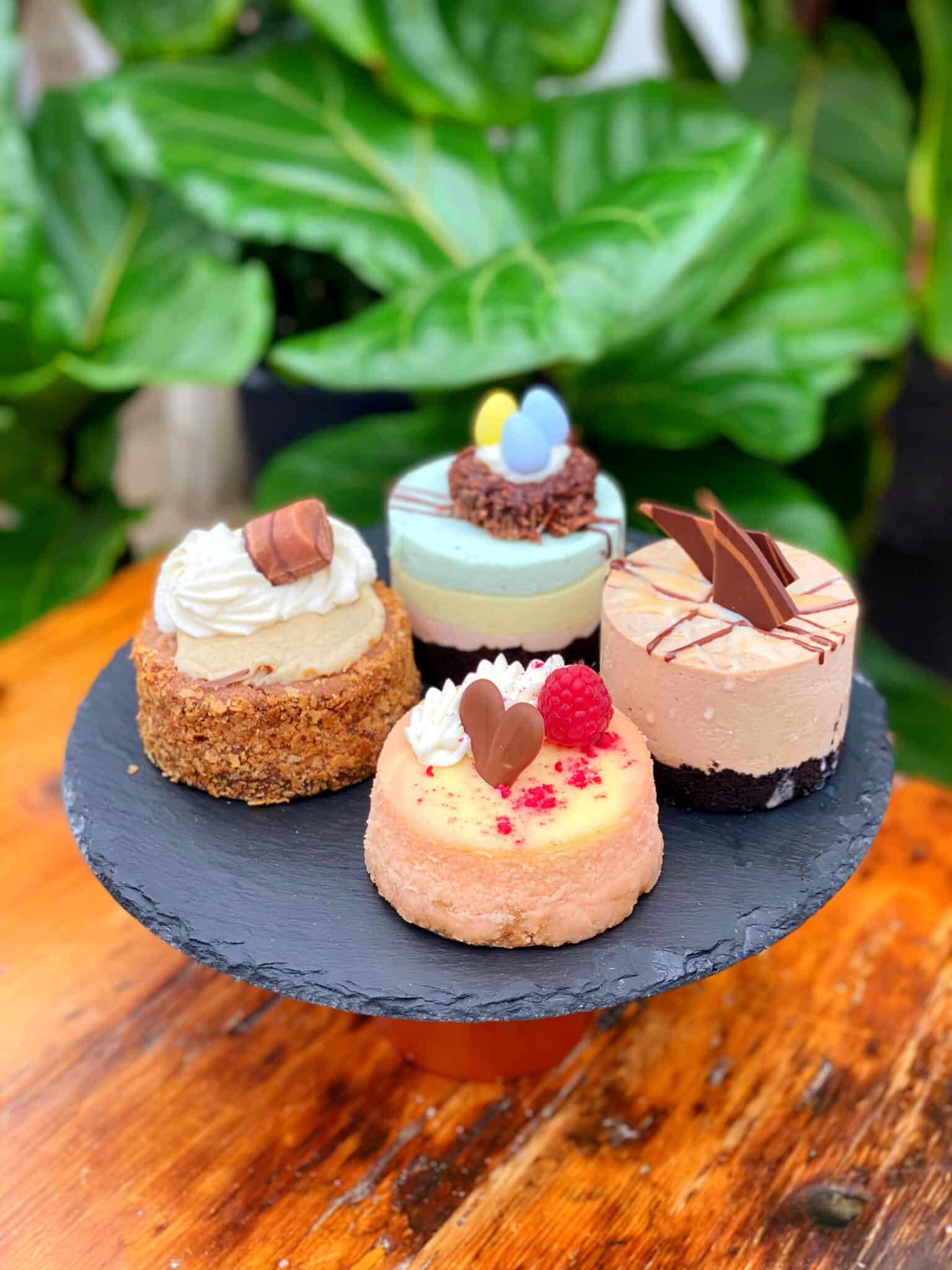 Mini Egg Cheesecakes, Cream Egg Cheesecake, Raspberry White Chocolate Cheesecake & the Kinder Bueno Cheesecake.