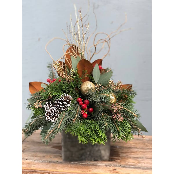 Create an elegant greenery piece designed to compliment a table, coffee table or side table. This arrangement will be created very much like our outdoor urn, but smaller and compact. This long lasting piece will feature Christmas greens of cedar, silver fir, eucalyptus and magnolia. Natural decorations of curly willow and pine cones along with your choice of coloured Christmas balls, will complete this outstanding piece.