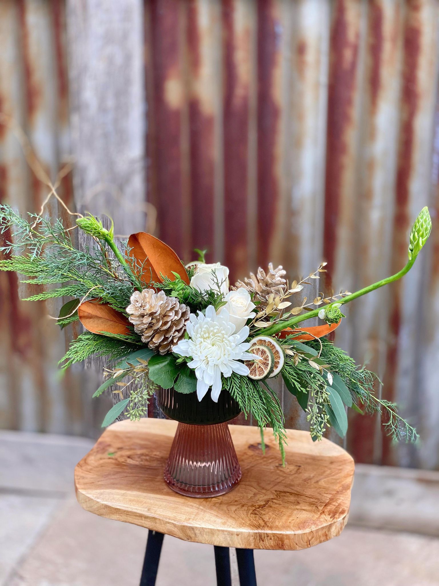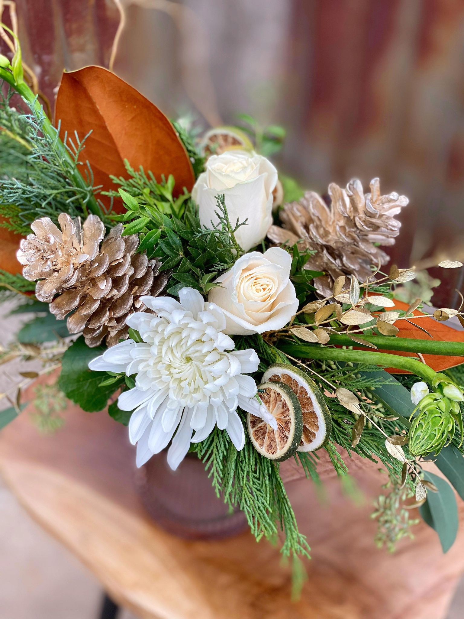 Take home your very own piece of winter with this lovely floral design. Soft white roses are accented with white mums and star of bethlehem. Winter boughs with gold accents throughout, pinecones and lime slices accenting this arrangement. This arrangement is designed in a 4.5” blush glass pedestal container and is perfect for your Christmas table.